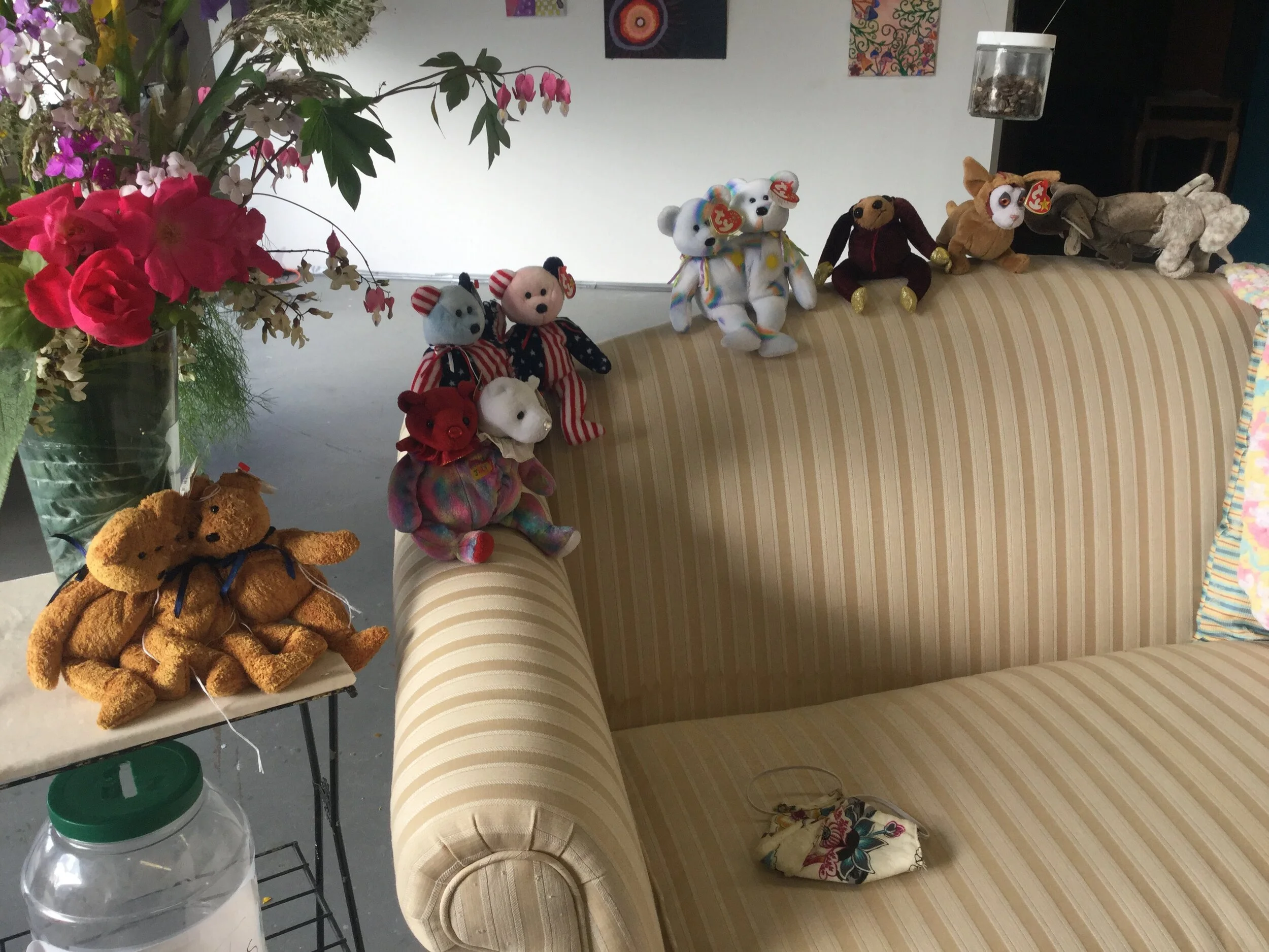 Most people involved were not artists, and through word of mouth the invitation extended to professionals—but we wanted them to contribute things they didn’t normally do. We decided to take whatever anyone gave us to install n the space until the point came that we could have a closing party with guests in person. We started with Shari’s painting of beets, a sculpture made of weeds from my mom’s garden, some bird houses, flower bouquets, and a mobile made of animal bones, and ended—8 weeks later—with a varied assortment of over 75 pieces of art made by non-artists and artists from our community.